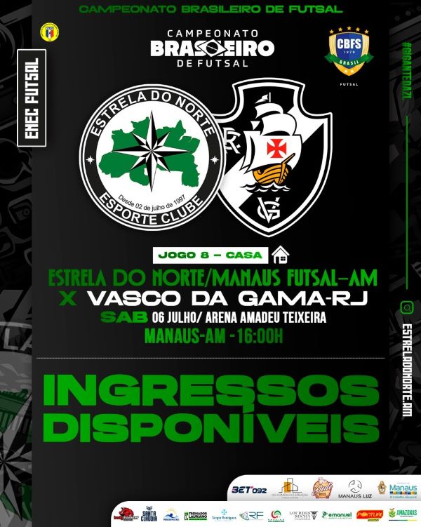 Um jogo histórico na Arena Amadeu Teixeira. É isso que prometem as equipes do Estrela do Norte/Manaus Futsal, representante do Amazonas, e Vasco da Gama, do Rio de Janeiro. Válido pela oitava rodada da primeira fase, o duelo acontece no próximo sábado (6), a partir das 16h, no principal ginásio da capital amazonense. Os ingressos estão disponíveis em sete pontos de venda.