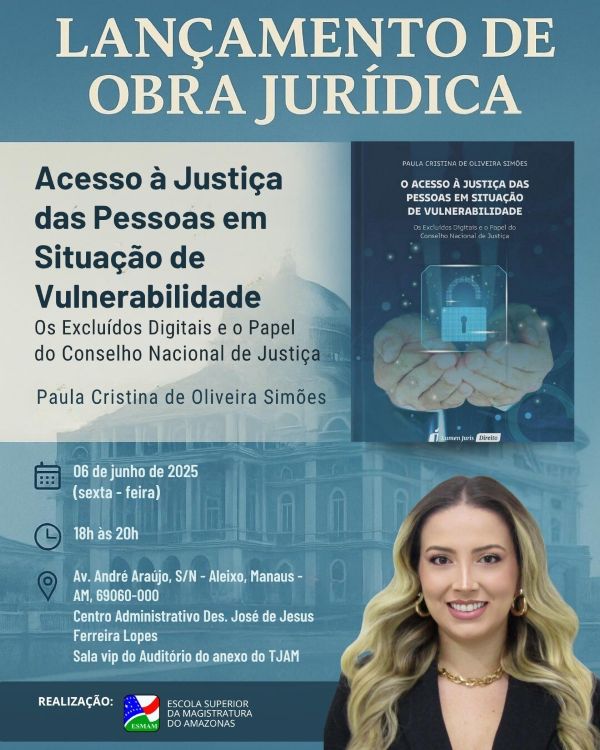 A Escola Superior da Magistratura do Amazonas – Esmam, promoverá no próximo dia 6 de junho de 2025, sexta-feira, às 18h, o lançamento da obra “Acesso à Justiça das Pessoas em Situação de Vulnerabilidade: os excluídos digitais e o papel do Conselho Nacional de Justiça”, de Paula Cristina de Oliveira Simões, na Sala VIP do Auditório do Centro Administrativo Desembargador José de Jesus Ferreira Lopes – Tribunal de Justiça do Estado do Amazonas – Av. André Araújo, S/N – Aleixo. A autora é filha do desembargador João de Jesus Abdala Simões, ex-diretor da Esmam e Decano do Tribunal de Justiça do Amazonas.