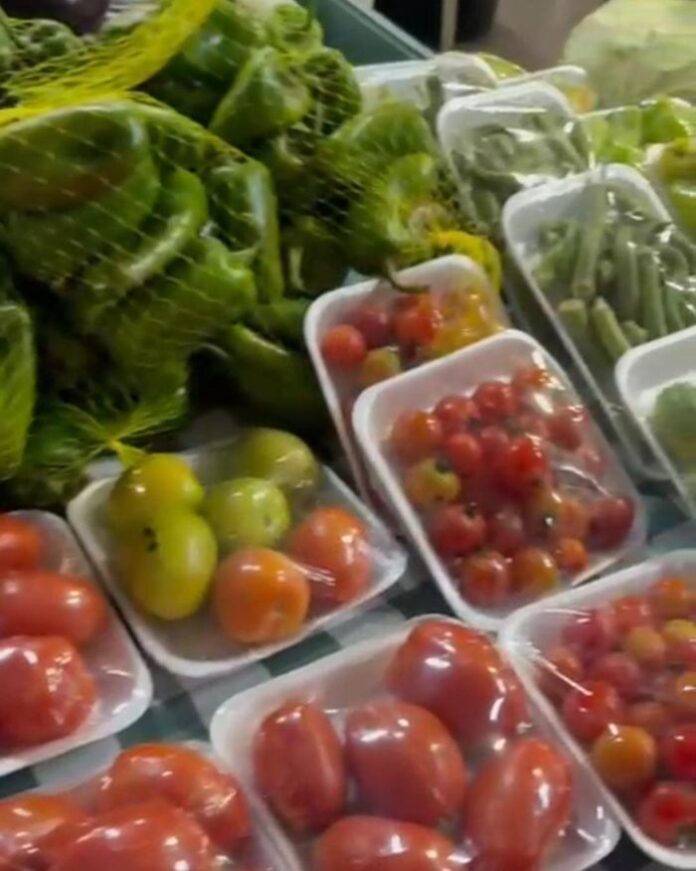 Entre os itens disponíveis, há uma variedade de frutas como laranja, banana, abacaxi, uva, pitaya, maracujá, melancia e mamão, além de verduras e legumes como alface, couve, cenoura, abobrinha, repolho, brócolis e couve-flor.