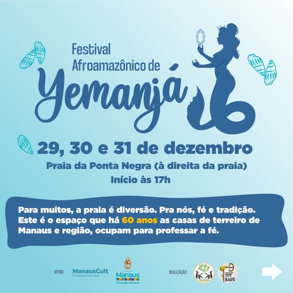 - O que é: 15° Festival Afro-Amazônico de Yemanjá Quando: 29, 30 e 31 de dezembro de 2025