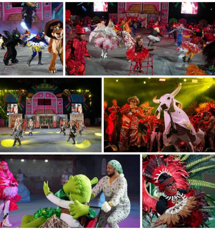 Abrindo a noite, a quadrilha cômica Folia e Fuleragem trouxe o tema “Entre sonhos e pesadelos”. A apresentação brincou com o universo da DreamWorks, misturando realidade e fantasia em um espetáculo pensado para o público infantil, com coreografias lúdicas, humor leve e uma construção visual impactante. “Trabalhamos com muito cuidado para manter o tom infantil, e tudo foi construído desde outubro do ano passado”, contou o coreógrafo Rhandy.