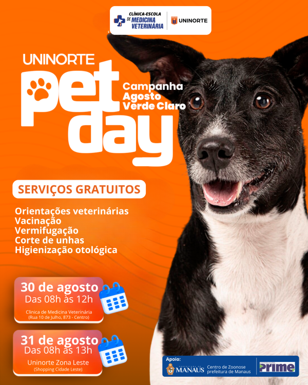 A UNINORTE promove, em 30 e 31 de agosto, o Pet Day. A ação é voltada para a saúde e o bem-estar dos animais de estimação, oferecendo serviços gratuitos. Na primeira data, o evento acontece na Clínica-Escola de Medicina Veterinária, localizada na Rua 10 de Julho, 873, no Centro. No dia seguinte, é realizado no campus Zona Leste, localizado no Shopping Cidade Leste, na Av. Autaz Mirim, 173, Tancredo Neves. Os atendimentos são sempre ofertados das 9h às 12h.